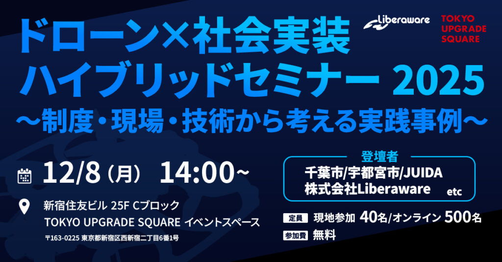 当社は公益財団法人 東京都中小企業振興公社、TOKYO UPGRADE SQUARE、株式会社Liberaware共催イベント「ドローン×社会実装ハイブリッドセミナー 2025 ~制度・現場・技術から考える実践事例~」ハイブリットセミナー(現地・オンライン)を開催します。
