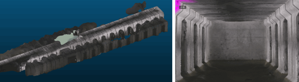 「IBIS2」で撮影した動画データをもとに点群デーをタ生成し、管路内部の3Dモデルを構築しました。さらに、3次元データ計測システム「SEAMS」により地上部の周囲環境を取得し、その情報をもとに地上・地下を一体化した3次元データの作成に成功しました。