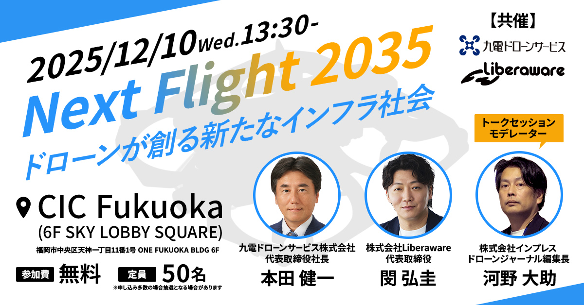 【12月10日(水)九電ドローンサービス・リベラウェア共催イベント開催】Next Flight 2035 ドローンが創る新たなインフラ社会@CIC Fukuoka